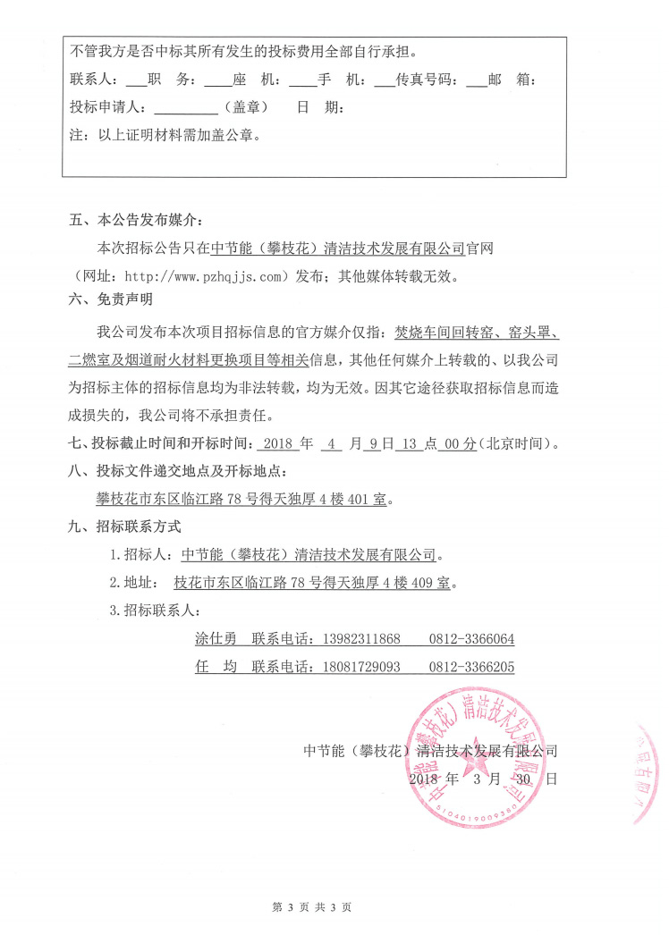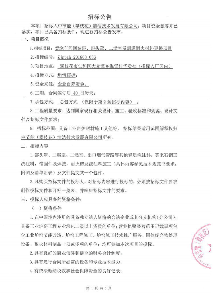 焚燒車間回轉(zhuǎn)窯、窯頭罩、二燃室及煙道耐火材料更換項目招標公示