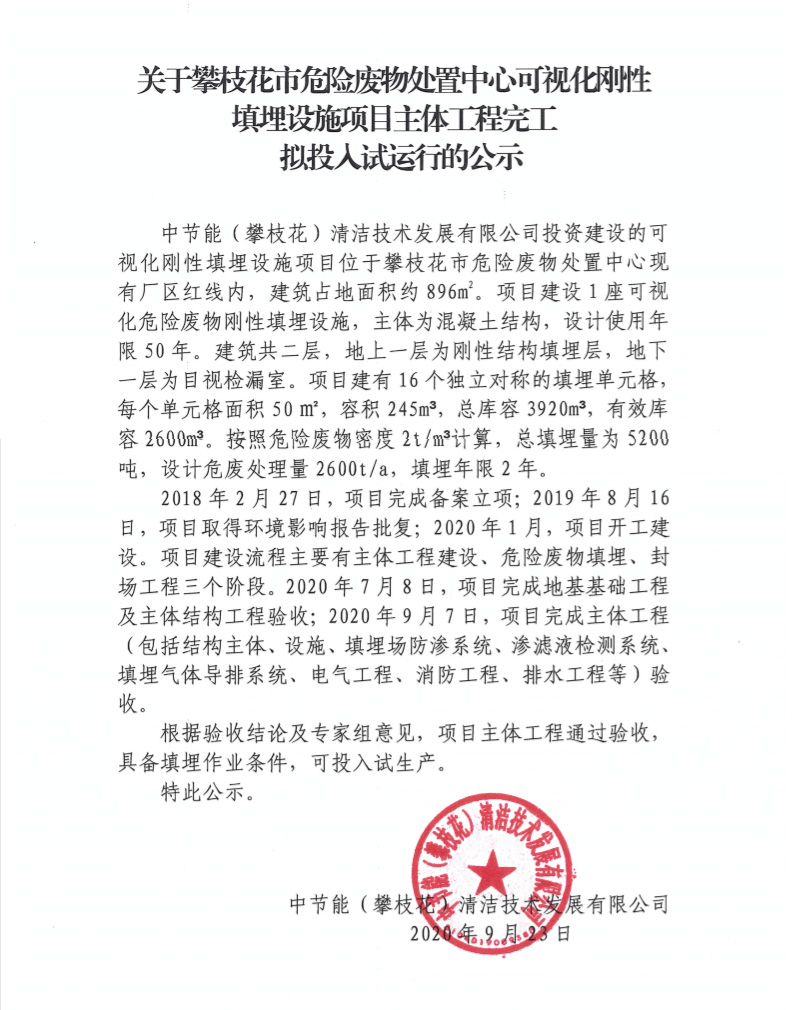 關(guān)于攀枝花市危險(xiǎn)廢物處置中心可視化剛性填埋設(shè)施項(xiàng)目主體工程完工擬投入試運(yùn)行的公示